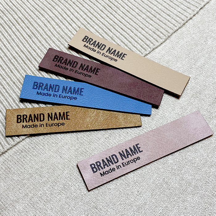 This Faux leather label Model EP-M146 can be customized just in a few seconds, very simply and quickly using the graphic builder, where you can choose the color of the faux leather, you can insert your own logo or any other graphics with a complex design, and you can customize the label with your own text, for example your brand name, a slogan, manufacturer's name, and the country where your product was manufactured.