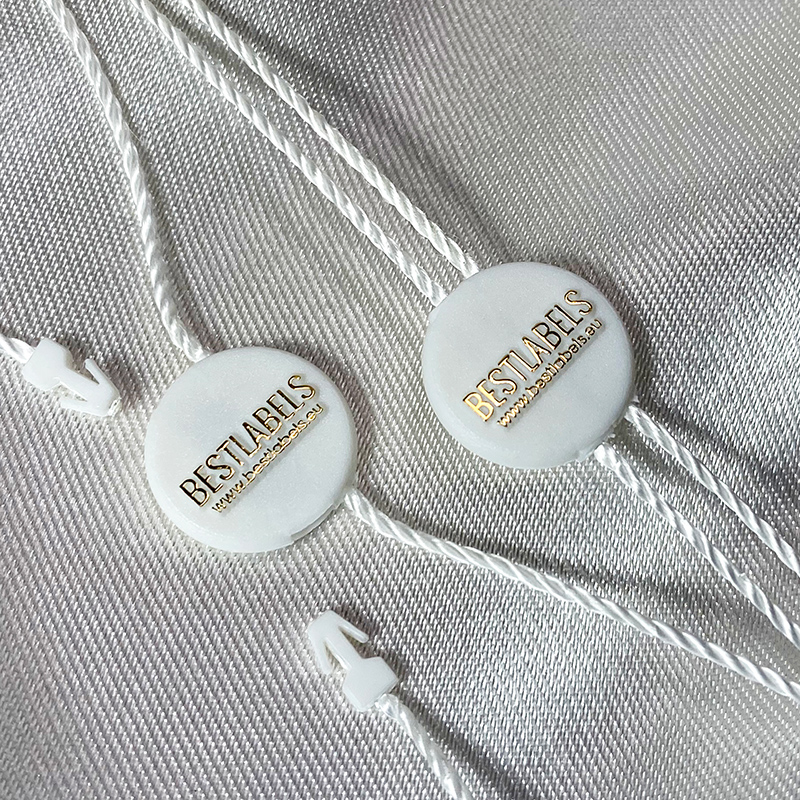 Plastic seal with an elegant design and a round shape ST-M44, can be customized on two sides with the Brand name or the emblem/trademark, and it is ideal for products such as clothes, bags, shoes. This type of seal is made of high quality materials, using the most advanced technologies in the field.