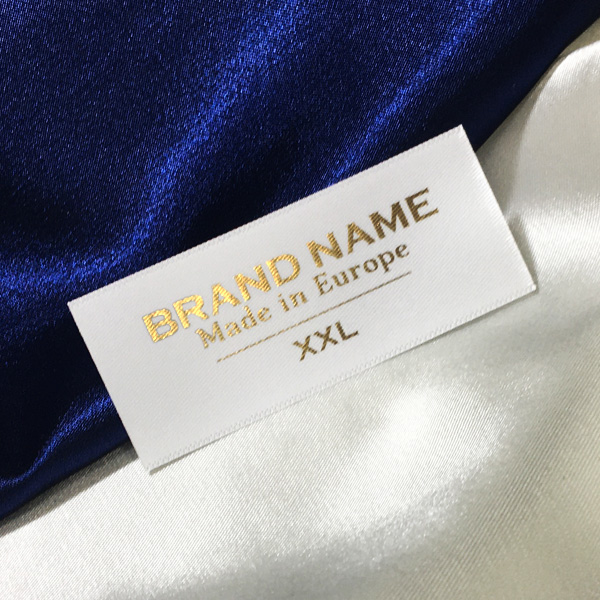 Custom label TL-M48 printed on satin fabric suitable for clothing, clothes accessories, and other textile products.